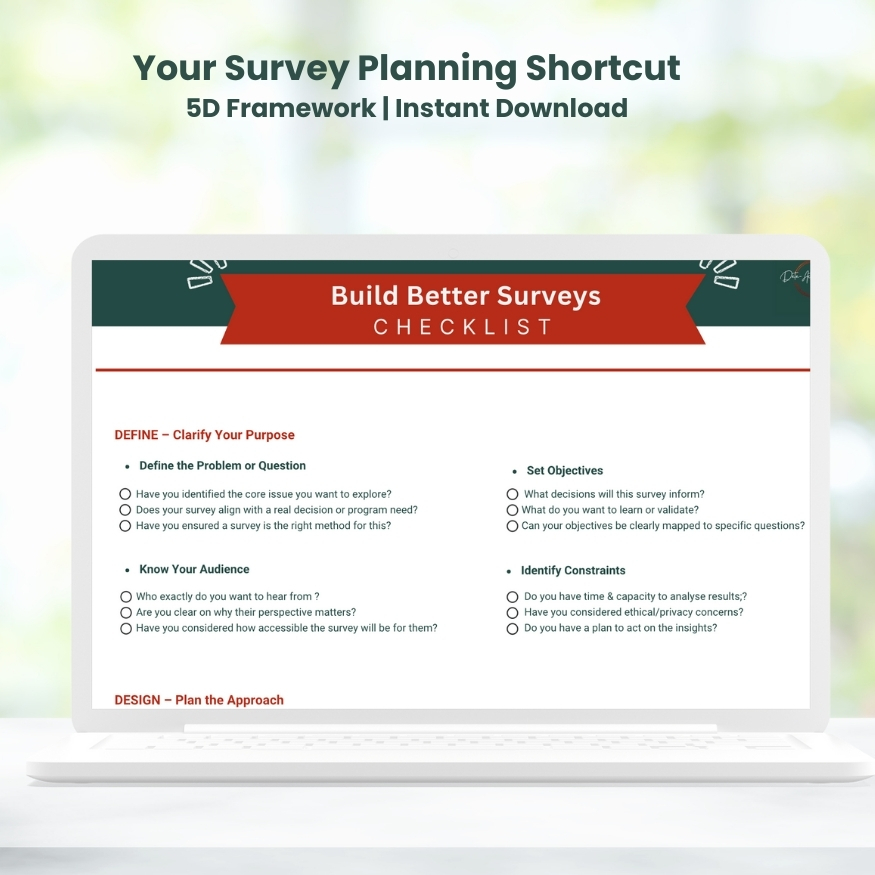 You will get: ✅ A 2-page printable PDF checklist ✅ A practical 5-step framework to guide your survey process ✅ Tips to avoid common mistakes and improve survey clarity ✅ A tool you can reuse for every project—from planning to analysis